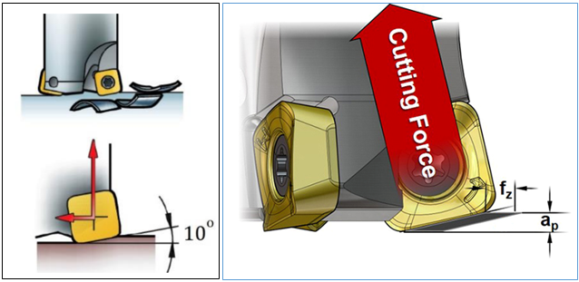 Entering angle 9-15 độ là điểm quan trọng nhất giúp phương pháp này, phay với bước tiến nhanh nhưng vẫn đảm bảo được phoi mỏng, đồng thời lực cắt hướng trục giúp giảm rung động khi gia công.